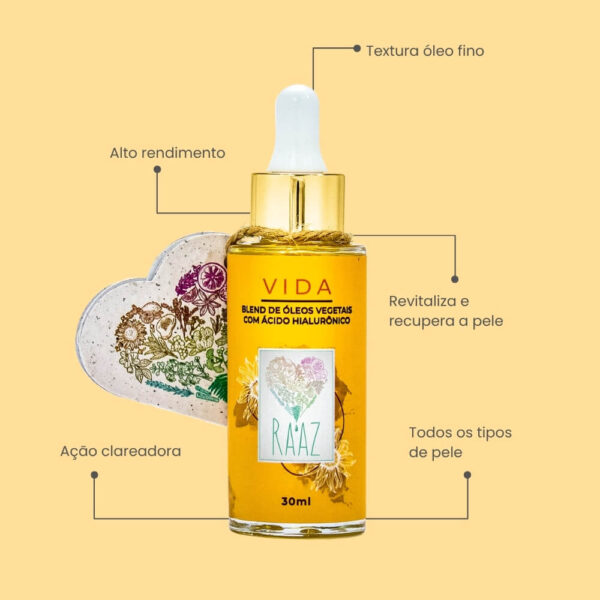 Através de uma combinação única de óleos vegetais + óleos essenciais + ácido hialurônico vegano o VIDA oferece à pele múltiplas fontes de tratamento em um só produto.