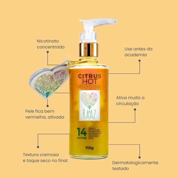 Tem ação termogênica e já começa a hiperemia forte depois de 5 minutos. A hidratação que promove é devida aos óleos vegetais da fórmula. É um redutor de medidas e tratamento contra celulite, além de efeito detox do corpo. A Raaz sempre faz produtos com muitos ativos, para um tratamento global. O Citrus Hot é um creme termo ativo corporal com nicotinato de metila + uma combinação fantástica de 13 ativos. A pele absorve todo o creme, ficando suave, macia e hidratada.