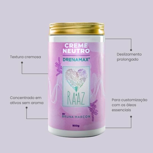 Creme multifuncional, super versátil. Sem óleo mineral e com base neutra, possibilita a customização através da adição de óleos essenciais à escolha do profissional, de acordo com o tratamento e com as necessidades dos pacientes. Com em Óleo de Semente de Uva, Manteiga de Karité e Vitamina E, o Creme Neutro DrenaMax é feito para manter a pele mais hidratada e sedosa. Suas propriedades umectantes e emolientes garantem um super deslizamento durante procedimentos de massagem, bem como maior espalhabilidade para uma melhor performance. Indicado para gestante.