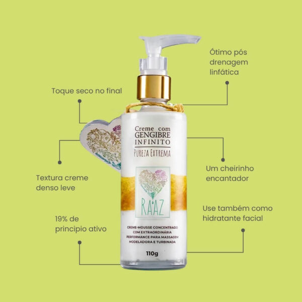 É isso mesmo que o nome diz: um creme com gengibre infinito. Mais que um creme, é um hidratante corporal de origem vegetal com textura de mousse. É como passar um veludo no corpo, você sente a pele absorver e logo a mente começa a relaxar!